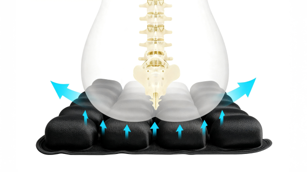 That's because its 24 interconnected air cells are designed to work with your body, not just under it. Instead of compressing under your weight like foam does, the air shifts and redistributes across every chamber, lifting your tailbone off the surface and spreading pressure evenly across your hips and sit bones. No pressure point takes the full load, no single spot grinds down until it hurts.