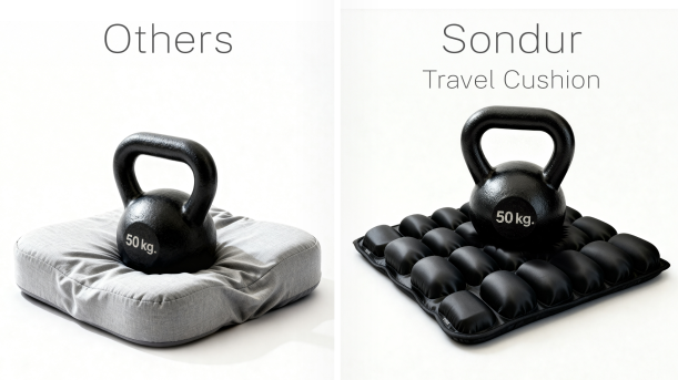 The reason they work is the same reason Sondur works: interconnected air cells that shift and redistribute pressure instead of compressing under it. Your weight doesn't concentrate on a single point, it spreads across every chamber, lifting your tailbone off the surface entirely. Hospitals have known this for years. Sondur finally made it affordable and portable, built for everyday life rather than wheelchair patients.