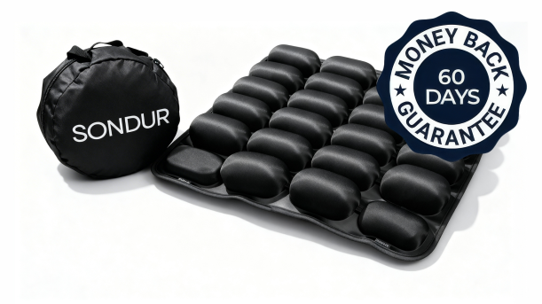 Meet the Sondur Pain Relief Cushion, the inflatable seat cushion with 24 interconnected air cells that redistributes pressure so completely, your tailbone, back, and hips stop hurting – even after hours in the worst seats imaginable!