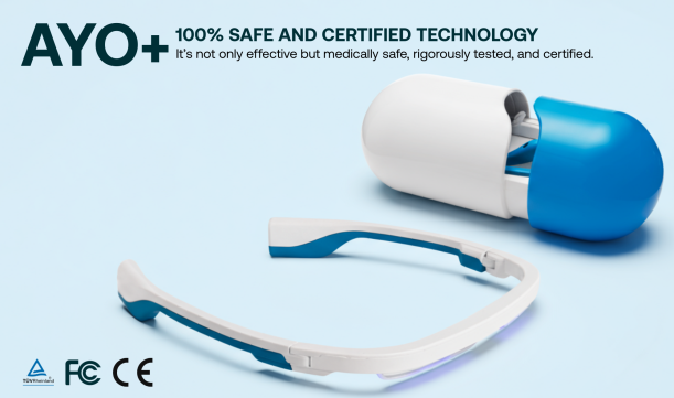 AYO+ est classé dans le groupe « exempt » pour le risque photobiologique et est certifié par des organismes de réglementation tels que FCC et CE, et a été certifié de manière indépendante comme sans UV et sûr pour une utilisation quotidienne par TÜV Rheinland. L'appareil utilise de la lumière bleue dans la plage de 470-475 nm, évitant spécifiquement les longueurs d'onde associées à des dommages potentiels aux yeux.