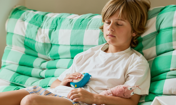 ingen skärm, inget blått ljus, ingen WiFi eller Bluetooth-signaler. Bara en mjuk, taktil andningsguide som ditt barn till och med kan använda i totalt mörker om det behövs.