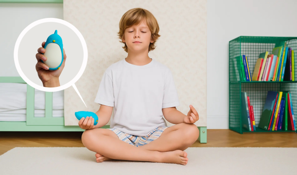 expanderar och drar ihop sig i vetenskapligt bevisade lugnande rytmer, vilket guidar barn att naturligt sänka sin andning utan att behöva tänka på det.